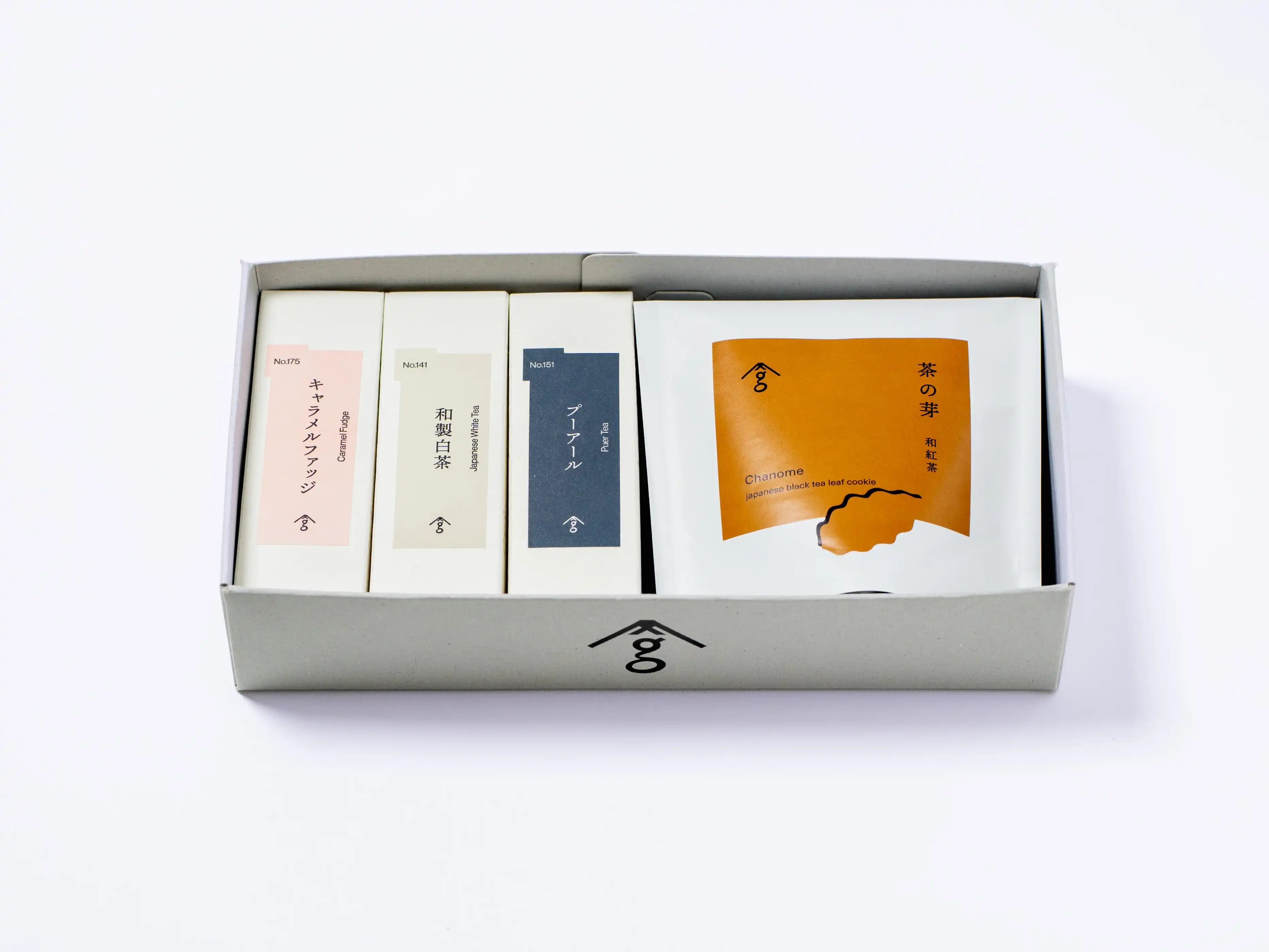 プーアール7.5g(2.5g×3ヶ)、キャラメルファッジ7.5g(2.5g×3ヶ)、和製白茶9g(3g×3ヶ)各ティーバッグ、茶の芽(ほうじ茶)のセット。